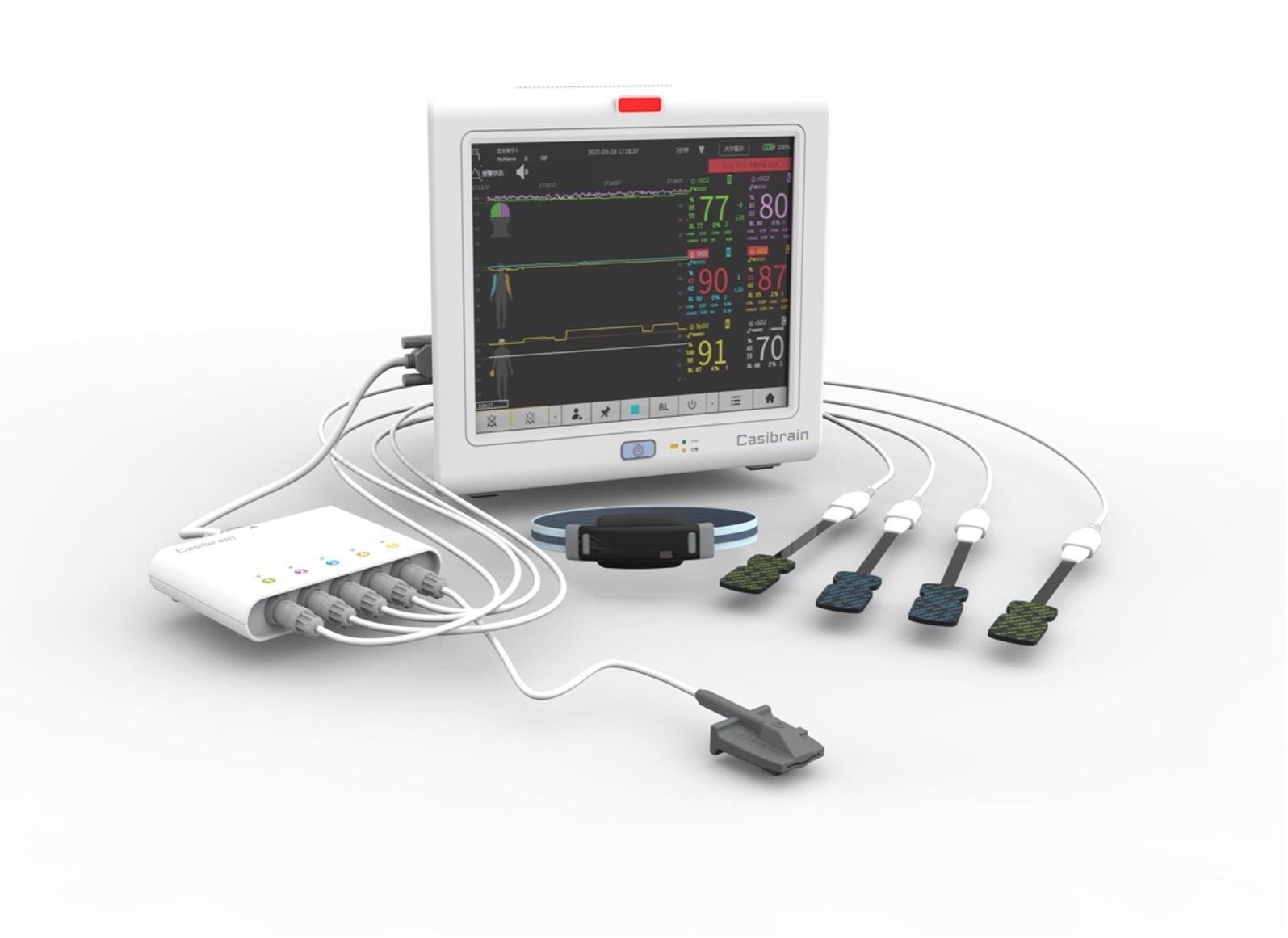 The Casibrain BRS-100 is a non-invasive monitoring system designed for the continuous measurement of local oxygen saturation. It supports cerebral (rSO₂), tissue (StO₂), and pulse oximetry (SpO₂), providing reliable, real-time data to support clinical decision-making and help reduce the risk of complications related to cerebral hypoxia.